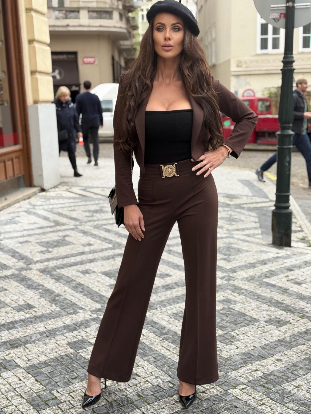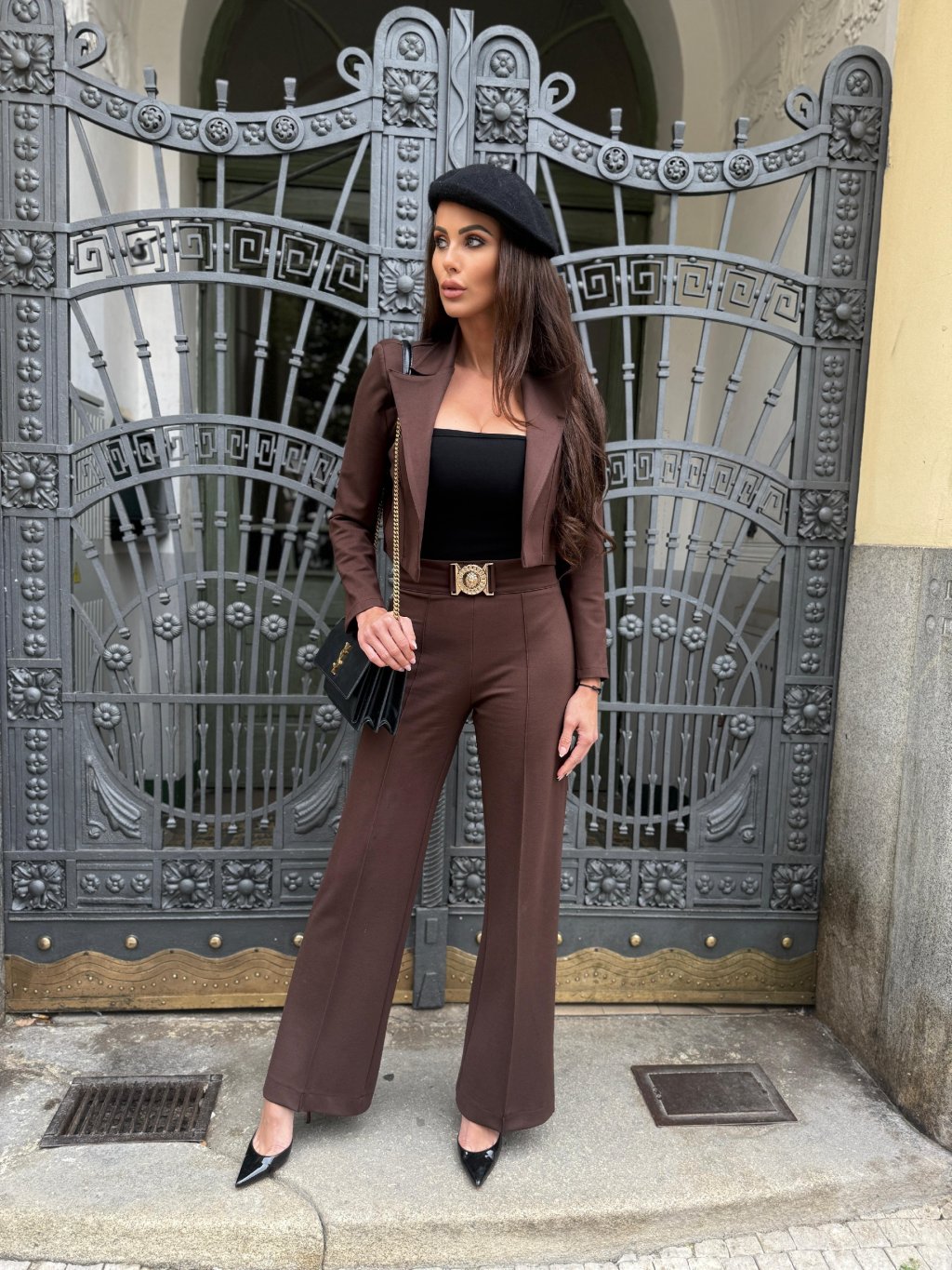 Kostýmek Amélie Brown v sobě spojuje eleganci, ženskost a francouzský šarm. Hladký, dokonale padnoucí střih zvýrazňuje postavu, zatímco sako v kratším provedení působí moderně a sebevědomě. Tmavě hnědý odstín dodává outfitu hloubku, teplo a sofistikovanost — perfektní volba pro ženy, které milují styl s charakterem. Jemná látka je příjemná na dotek a díky své pružnosti se přizpůsobí pohybu, takže se budete cítit pohodlně celý den.