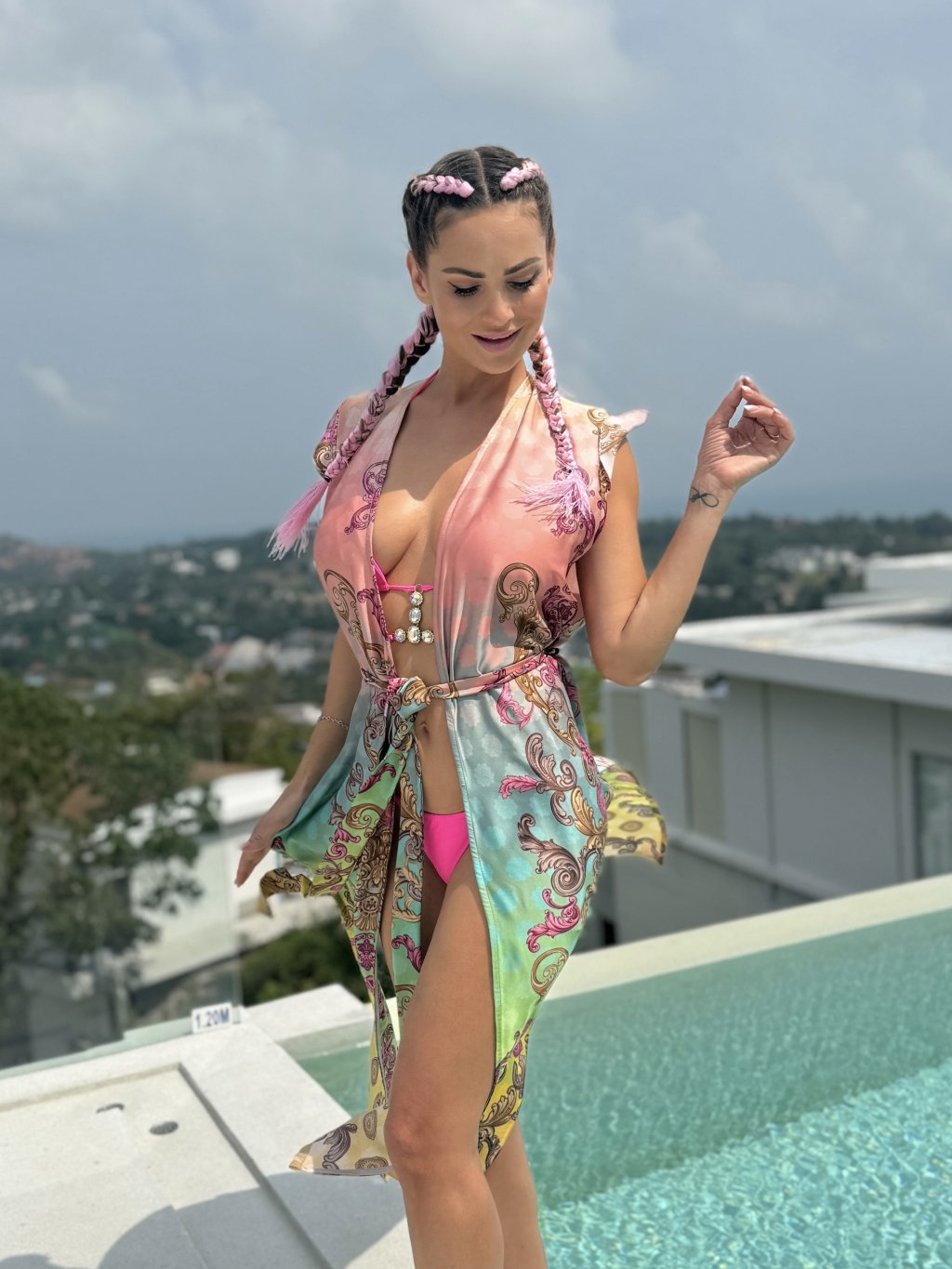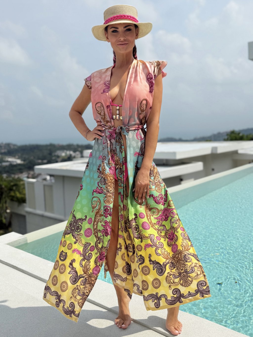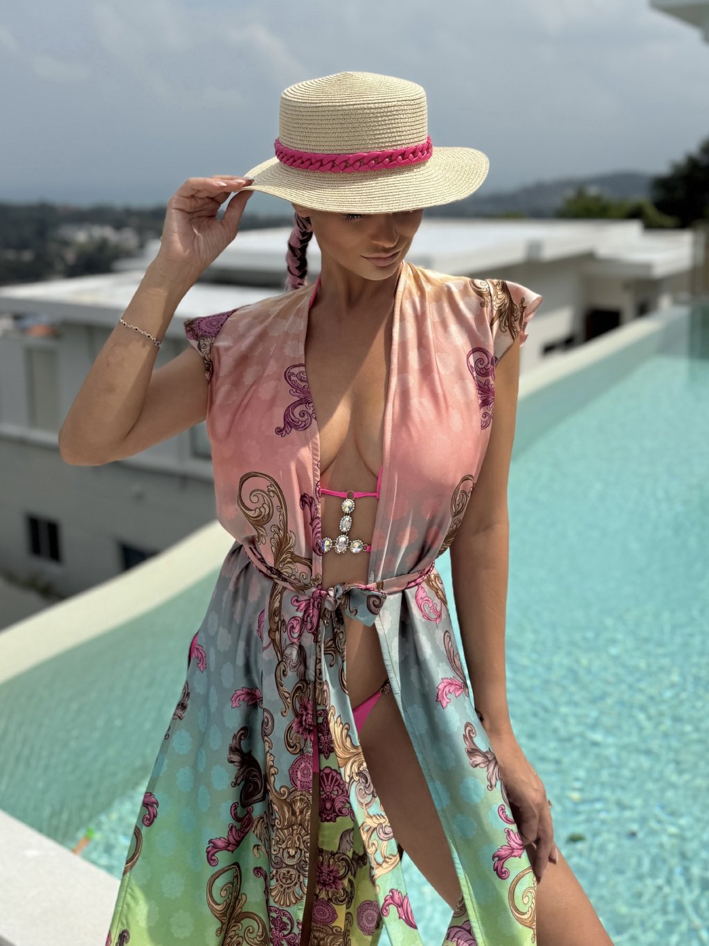 Tato luxusní plážová vesta je dokonalým doplňkem pro každou ženu, která chce na dovolené zazářit. Lehký vzdušný materiál, který jemně splývá s pohyby těla, přináší maximální pohodlí i během horkých letních dnů. Bohaté barvy a sofistikované vzory vytvářejí jedinečný boho-chic vzhled, který skvěle doplní nejen plavky, ale i letní outfit s kraťásky a topem. Elegantní střih s jemnými volánky a možností zavázání v pase podtrhne ženské křivky a dodá outfitu sofistikovaný nádech. Perfektní volba pro pláž, resorty i letní procházky po městě – buďte stylová a nepřehlédnutelná kdekoliv!