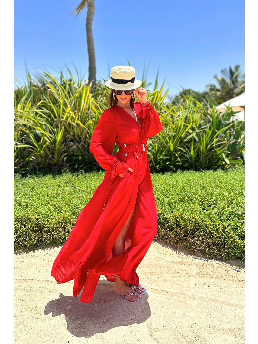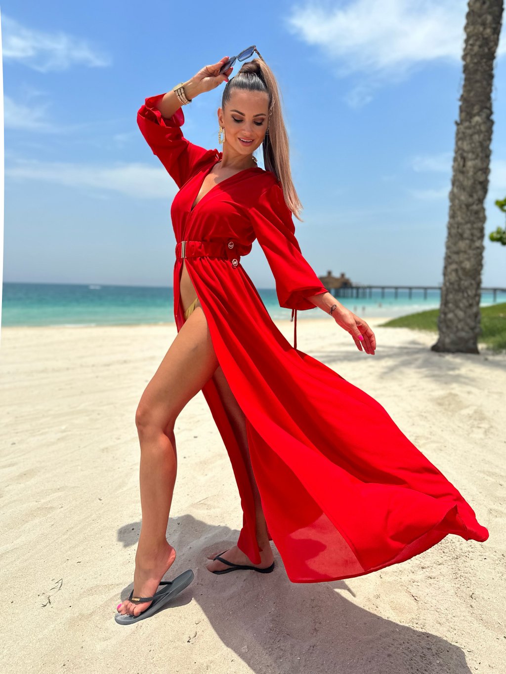 Red Swan is the iconic beach dress of our new collection. With its elegant yet sophisticated cut, you will be unmissable. The model is decorated with rhinestone swan buttons on the shoulders and waist, and the belt makes your silhouette stand out. The sleeves are long, but thanks to the sewn-in elastic you can move them as you please. The lightweight material carries beautifully and the model is very comfortable. The Black Swan should be a staple in your beach wardrobe.