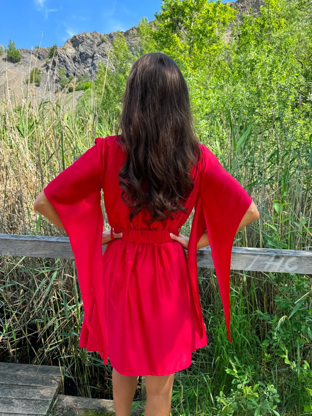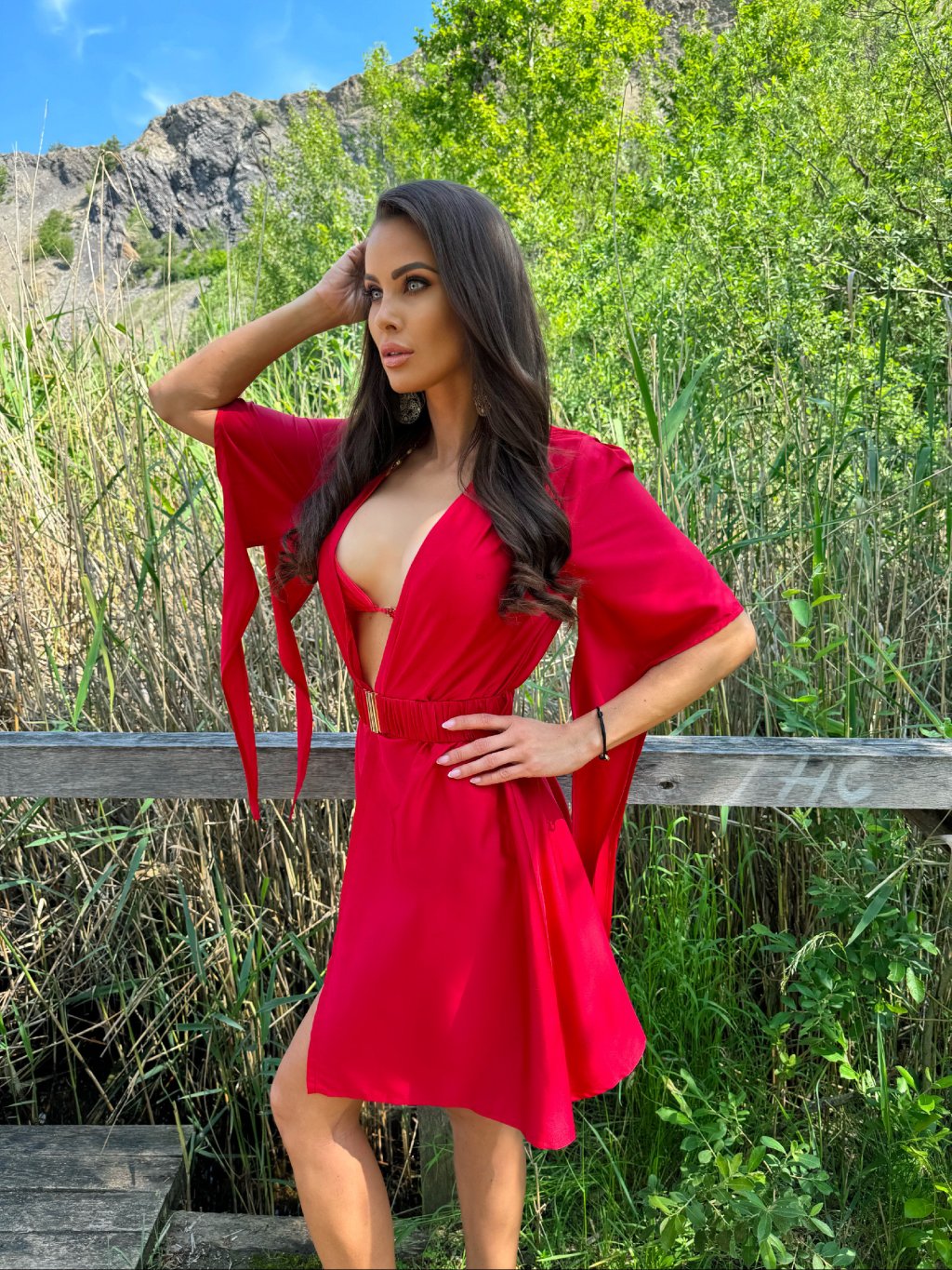 The seductive red color of the Sandra model is accentuated by gold accessories such as the Luna earrings and the Sunset bracelet. The Senorita hat in black adds a touch of elegance.