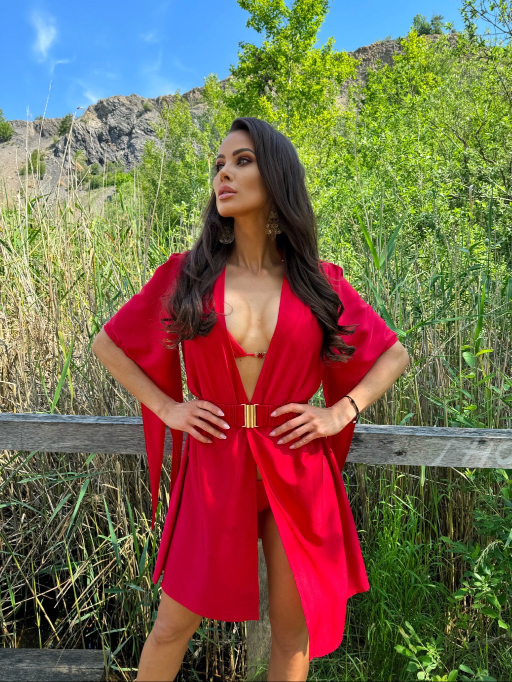 The luxurious Sandra model is made of high quality and lightweight Armani silk. The fabric is extremely comfortable on the body and thanks to its versatile cut, you can wear it as a cover-up over your swimsuit or as a beach dress. The model is very sophisticated and dominates not only with its beautiful pattern, but also with the cleverly cut sleeves with two decorative tips, or the belt with a modern buckle, which is sewn from the same material as the rest of the model.