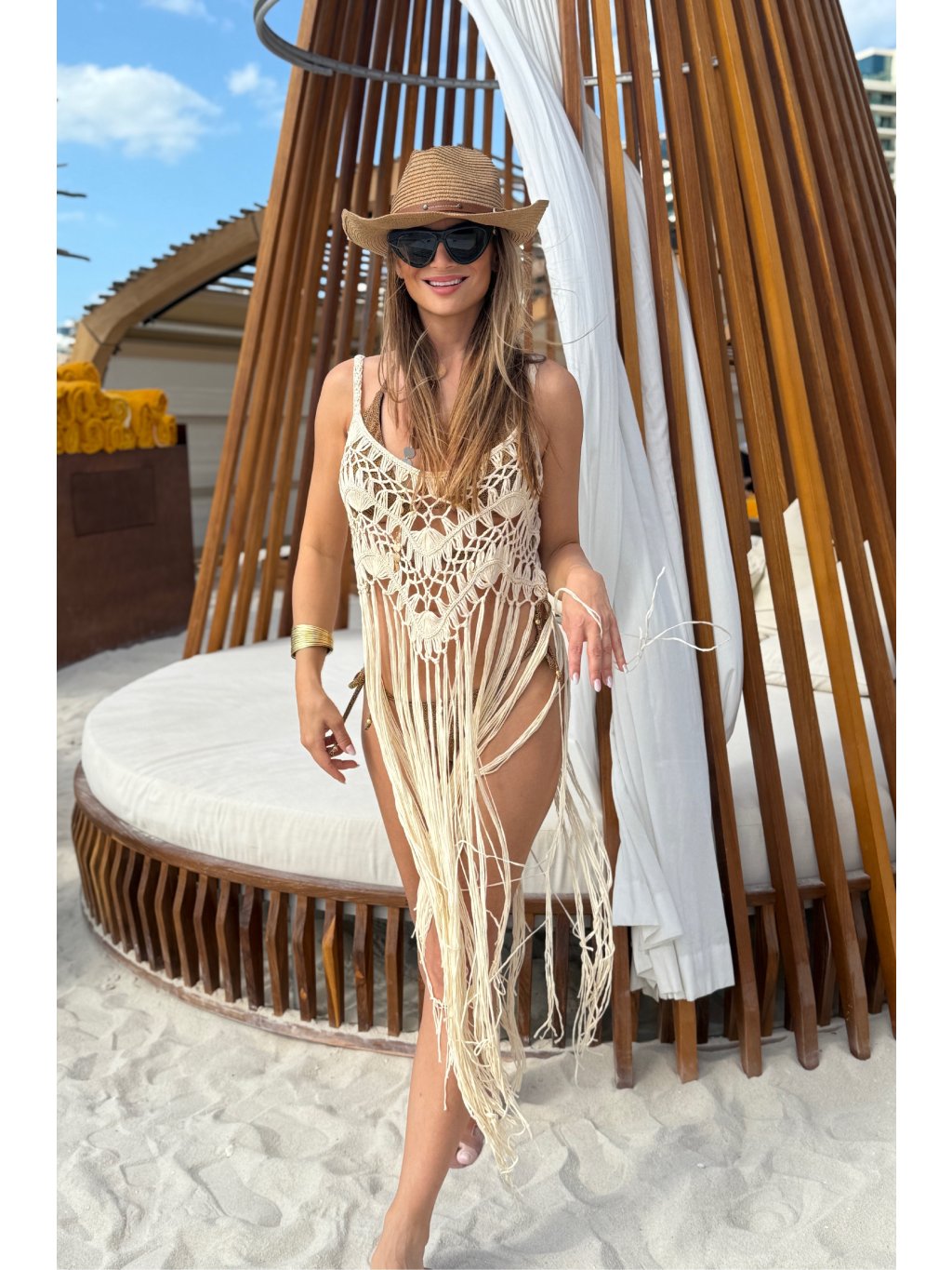 The Claudine short crochet top in beige with long tassels is an interesting piece that catches the eye at first sight. It's great as a swimsuit accessory for the beach, but also looks stylish as a top to go with shorts for summer fun. Thanks to the comfortable material, it is not only fashionable but also comfortable to wear. The model covers the necessary areas and is also very airy and comfortable. In short, the perfect piece for summer holidays