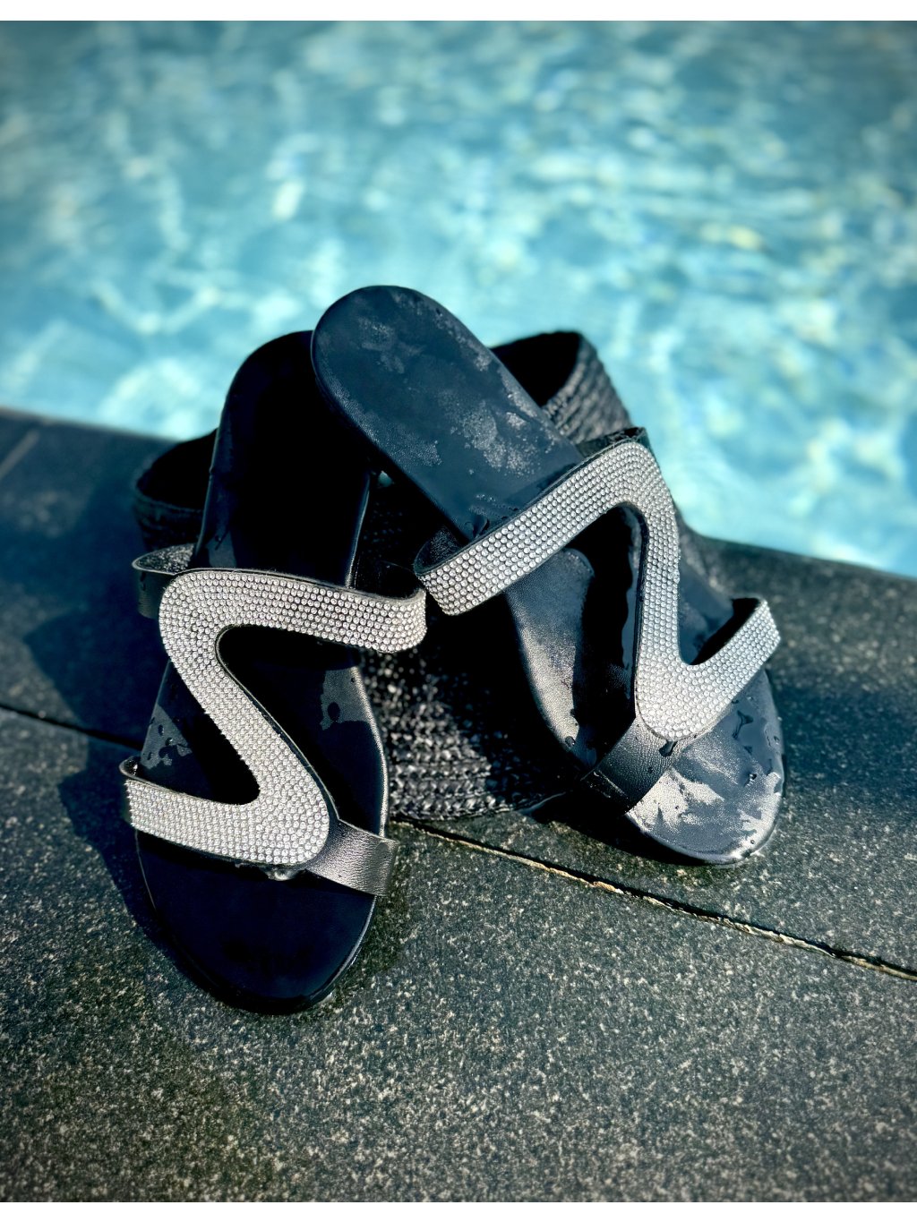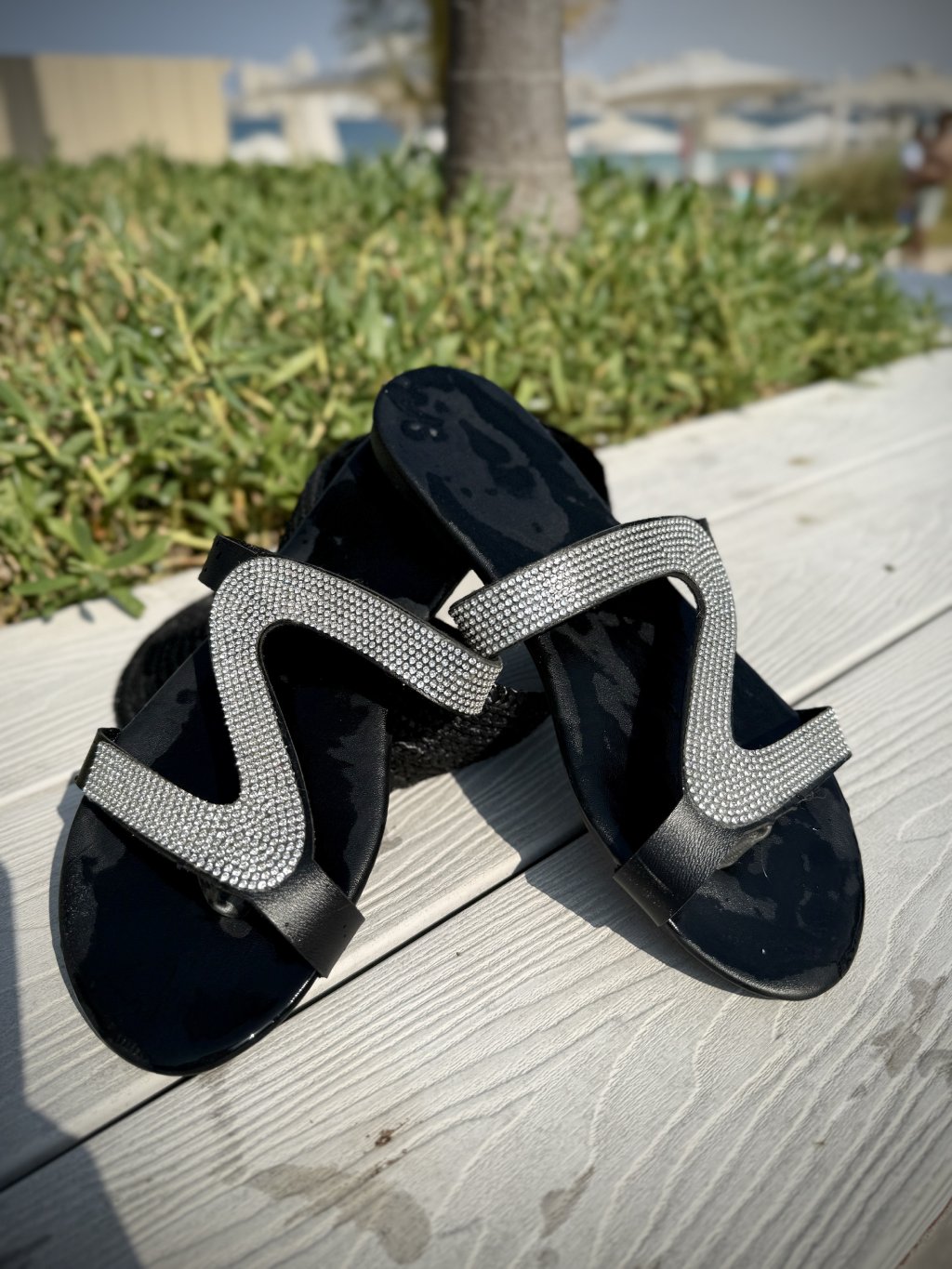 Sparkly slippers are the perfect choice for summer days full of style and elegance! These black slippers stand out with an interesting design and a silver rhinestone application in the shape of an inverted "S", which adds a unique sparkling effect across the instep. They are ideal for evening summer events and for diversifying your everyday outfit. In these summer slippers you will always be perfectly stylish and ready for any occasion.