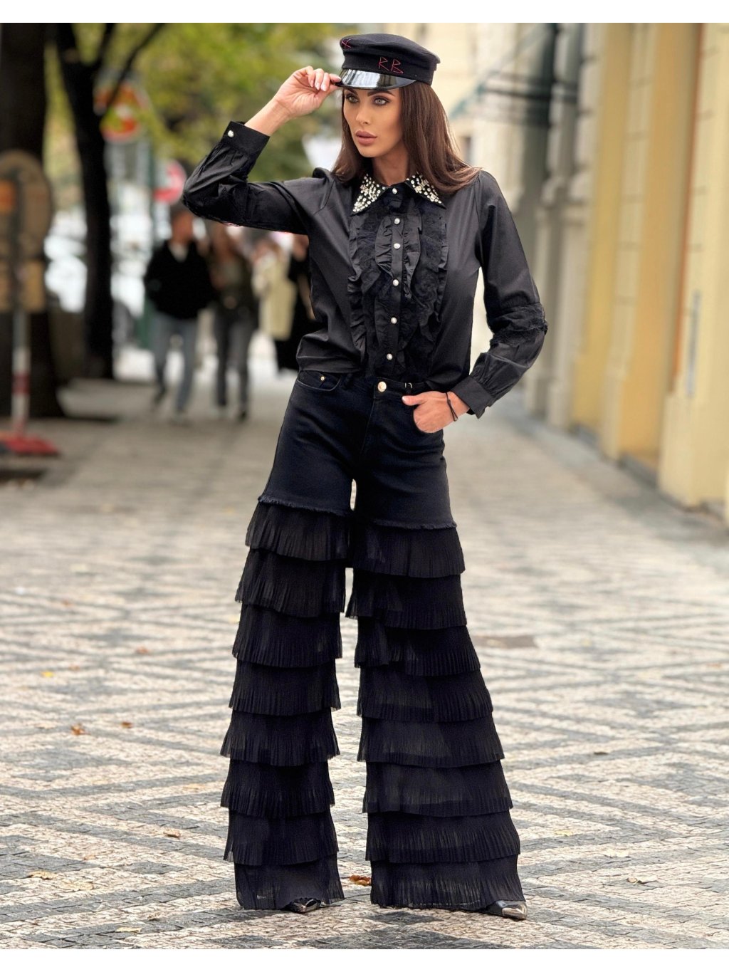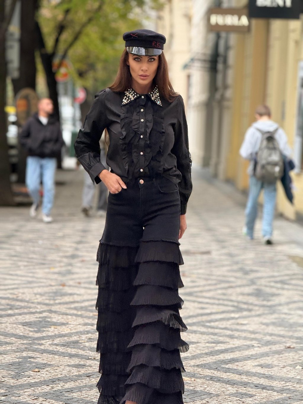 Elegantní černá košile Isabella spojuje klasiku s moderním stylem a ženskou rafinovaností. Přední část zdobí bohaté volány a perlové knoflíky, které jí dodávají romantický, ale sebevědomý nádech. Výrazný límeček osázený perlami a kamínky v kombinaci s jemnými krajkovými detaily na rukávech působí luxusně a originálně. Dokonalý kousek pro ženy, které chtějí vypadat elegantně, sebevědomě a nezapomenutelně. Krásně vynikne s jeansy Valentina a kabátkem Amélie Black.