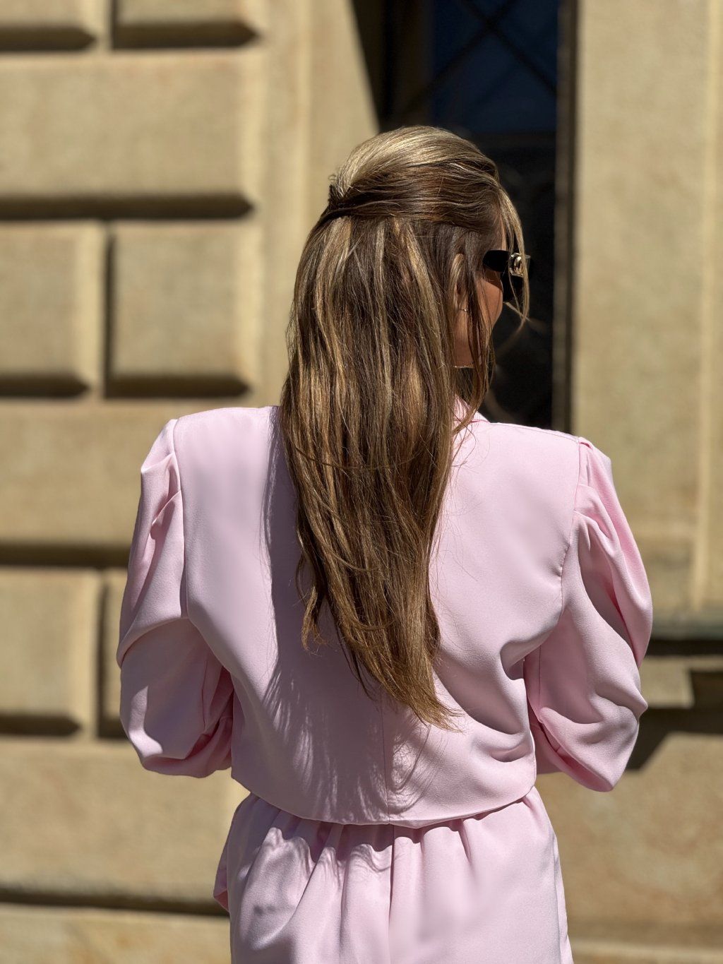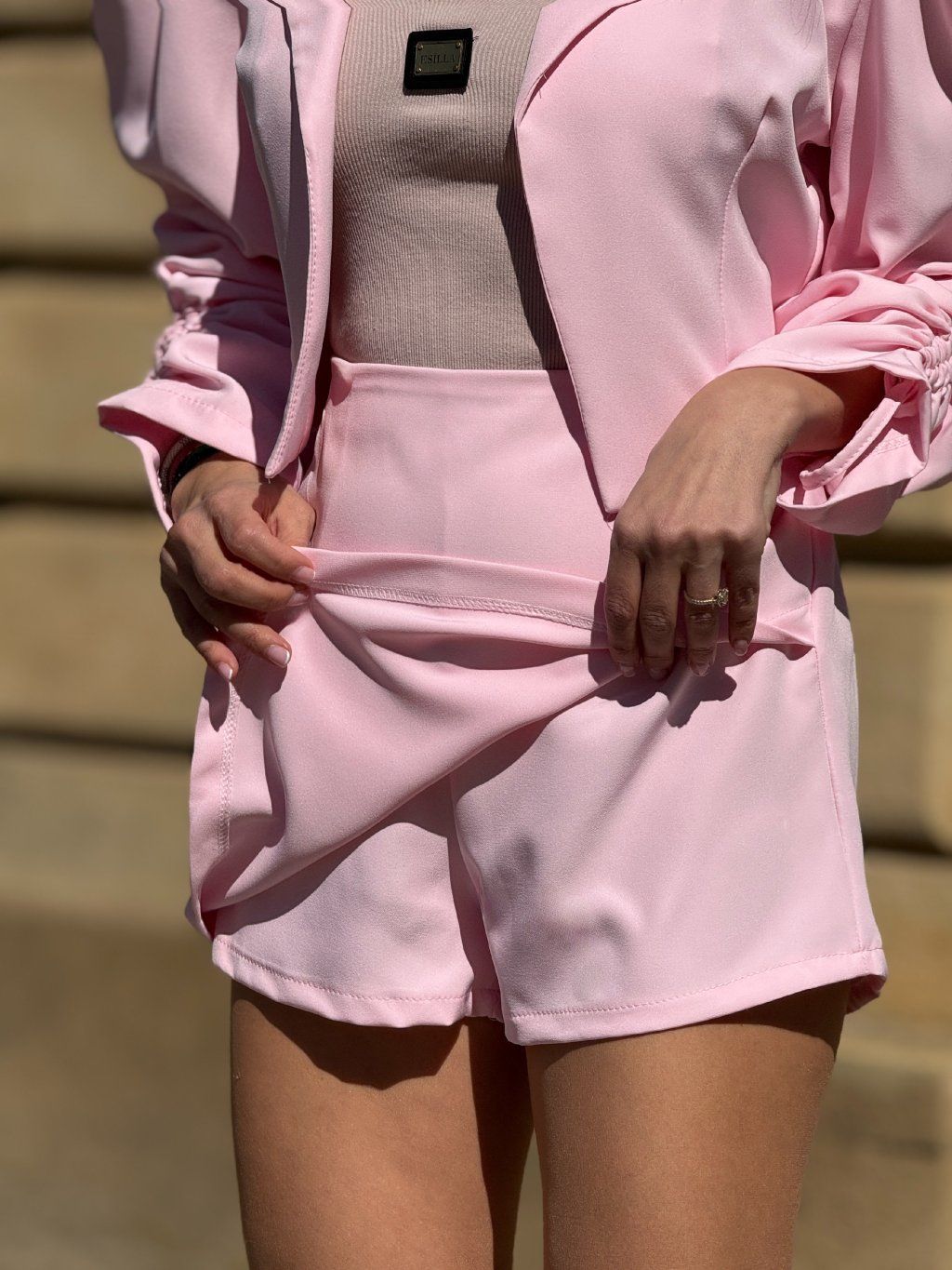Tento sofistikovaný růžový set v sobě spojuje ženskost, eleganci a moderní nádech inspirovaný návratem ikonických 90. let. Sako zaujme svým čistým střihem a jemným řasením na rukávech, které dodává celému looku stylový a lehce extravagantní detail. Spodní část tvoří šortky, které jsou chytře řešené tak, aby zepředu působily jako elegantní sukně – získáš tak maximálně ženský efekt, ale zároveň si zachováš pohodlí a volnost pohybu. Celek působí svěže, luxusně a sebevědomě, přesně pro chvíle, kdy chceš být nepřehlédnutelná.