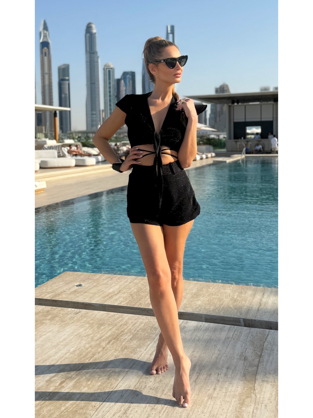 Krátké plážové kraťásky v elegantní černé barvě jsou nepostradatelným kouskem pro letní dny. Díky jemnému lesku, který se na sluníčku krásně třpytí a dodává modelu luxusní vzhled, se hodí na pláž i na večerní procházky. Kraťásky v pase zdobí pásek se zlatou sponou. Díky vysokému pasu se při nošení budete cítit pohodlně, ale zároveň i sexy.