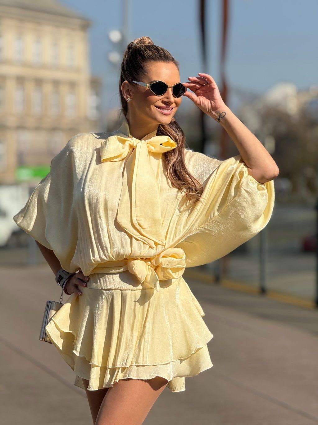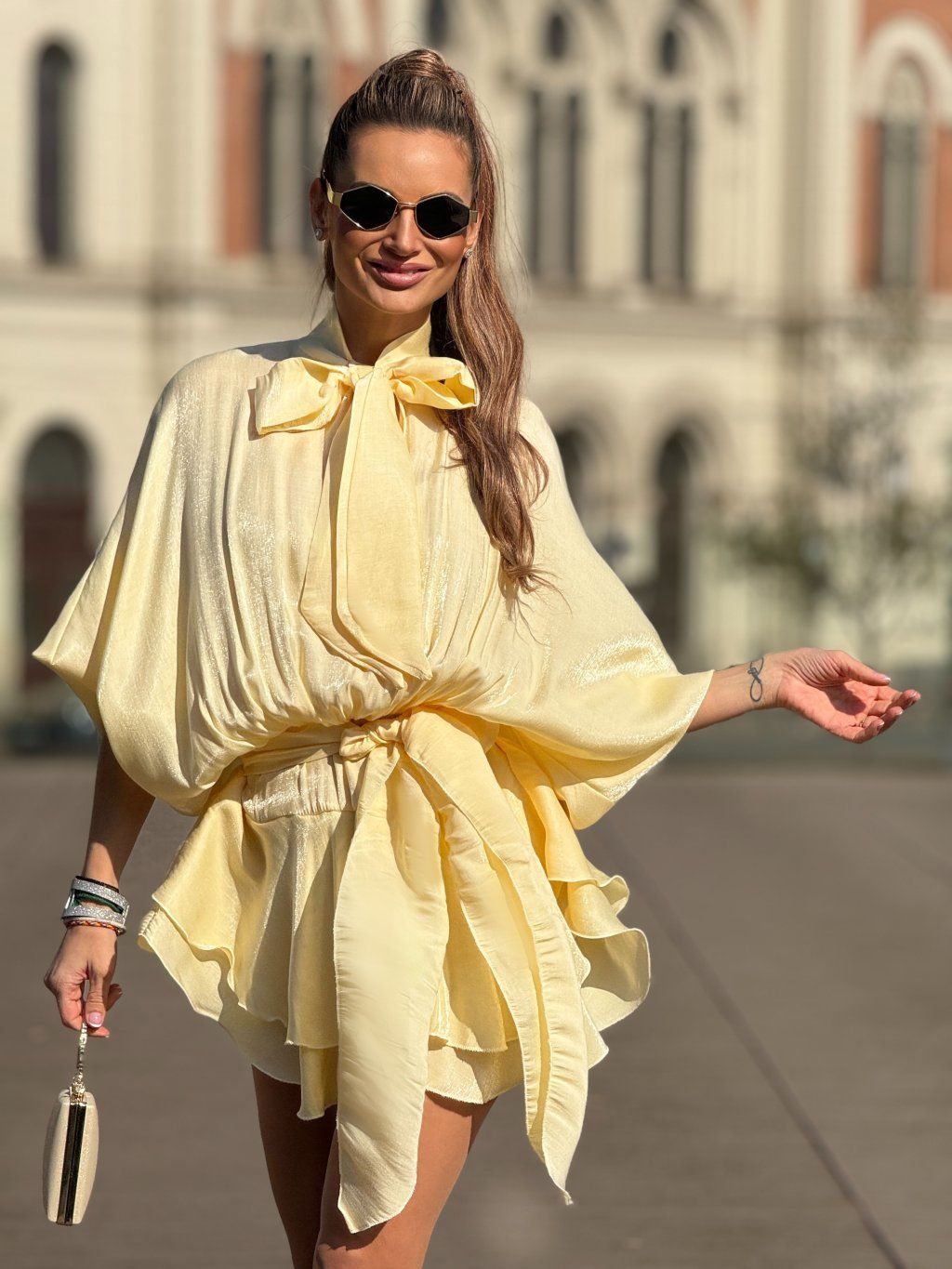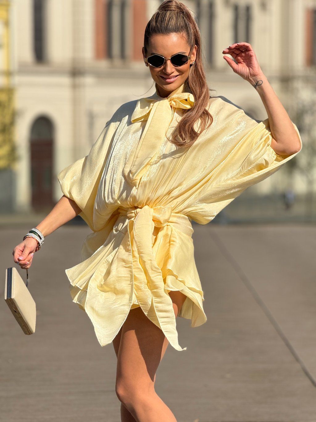 Lehké, vzdušné šaty v jemném žlutém odstínu, které působí něžně a zároveň velmi elegantně. Volnější, splývavý střih s výraznou mašlí u krku dodává modelu sofistikovaný charakter, zatímco stažení v pase krásně zvýrazní siluetu a vytvoří ženské křivky. Lesklý, hladký materiál jemně odráží světlo a při každém pohybu působí luxusně. Ideální volba pro chvíle, kdy chceš zaujmout s lehkostí a přirozeností.
