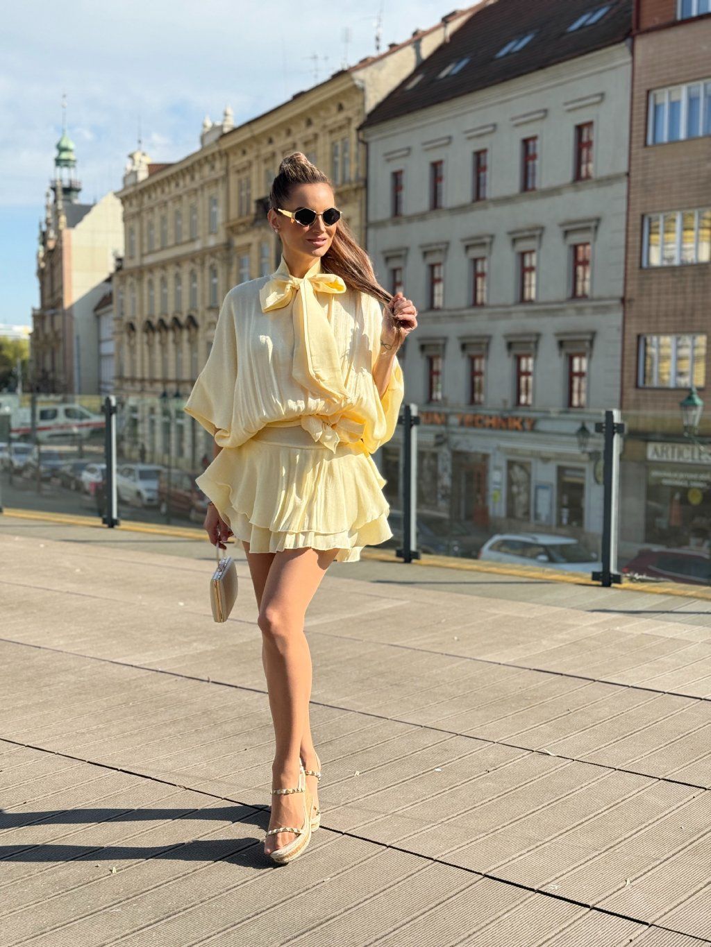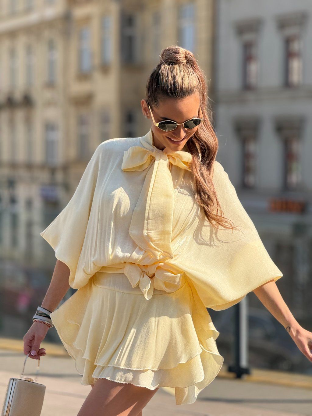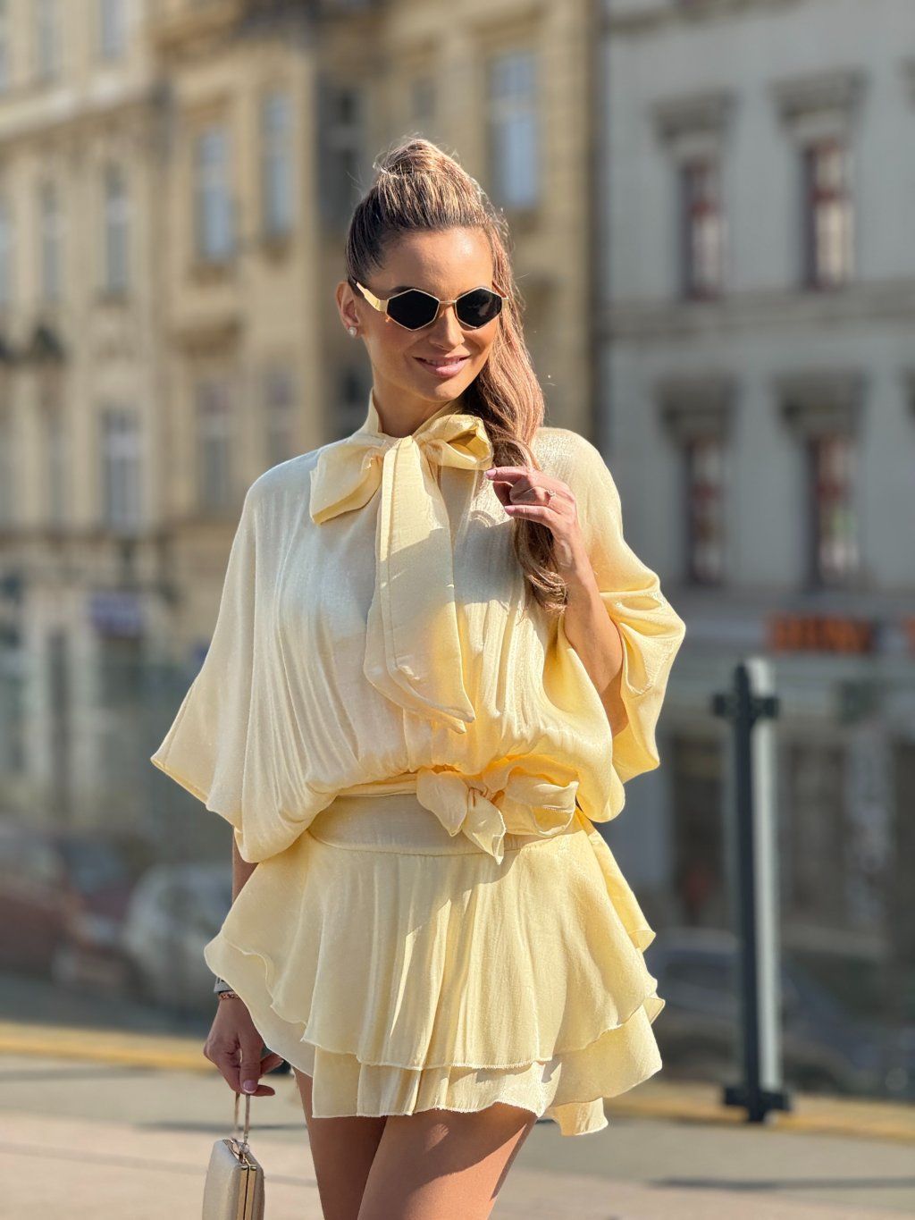Lehké, vzdušné šaty v jemném žlutém odstínu, které působí něžně a zároveň velmi elegantně. Volnější, splývavý střih s výraznou mašlí u krku dodává modelu sofistikovaný charakter, zatímco stažení v pase krásně zvýrazní siluetu a vytvoří ženské křivky. Lesklý, hladký materiál jemně odráží světlo a při každém pohybu působí luxusně. Ideální volba pro chvíle, kdy chceš zaujmout s lehkostí a přirozeností.